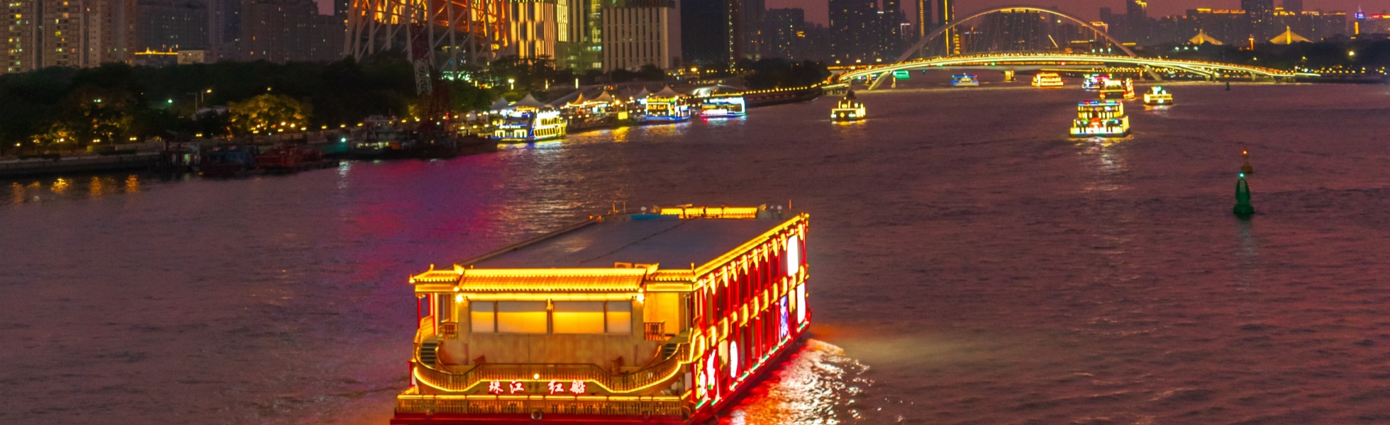 Por la noche, también puede optar por experimentar el Crucero Nocturno por el Río de la Perla. Con una longitud total de 2 129 kilómetros, el Río de la Perla es el cuarto río más grande de China. Puede visitar principalmente su sección central en Guangzhou, que tiene hermosos paisajes. Los distintivos cruceros de lujo llevan a los turistas a disfrutar del Puente Haiyin, el Puente Guangzhou, el Banco de Arena Haixin, la Torre Canton, la Plaza Huacheng, el Puente Liede, el Muelle de fiesta, que es el distrito de cultura y arte creativo de la cerveza y muchos otros lugares escénicos de élite. Todo el viaje dura de 60 a 90 minutos.