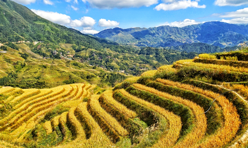 Longsheng Después del desayuno, nos dirigiremos hacia el noroeste hasta las Terrazas de Arroz de Longji, a una distancia de 76 kilómetros. Todo el proceso tomará alrededor de una hora y 40 minutos en llegar. Cubren un área de 66 kilómetros cuadrados y se distribuyen entre 300 y 1100 metros sobre el nivel del mar, con una pendiente máxima de 50 grados. Las terrazas son como cadenas, serpenteando desde el pie de la montaña hasta la cima de la montaña. Aunque su escala es majestuosa y magnífica, lo interesante es que, en este vasto mundo de campos en terrazas, el más grande no es más de un acre. Además, difunde una broma en el pueblo local que describe el tamaño de cada terraza: un propietario ordenó al granjero que arara sus 206 terrazas al pie de la montaña. Después de que el granjero terminó el trabajo, contó solo 205 terrazas. La última no se encontraba por ninguna parte. Desesperado, el granjero estaba a punto de volver a casa. Recogió la ropa, de pronto se dio cuenta de que aún quedaba una terraza cubierta. Por eso, todavía hay un dicho que dice que "la ropa ha cubierto la terraza" para exagerar la pequeña dimensión de cada parte.