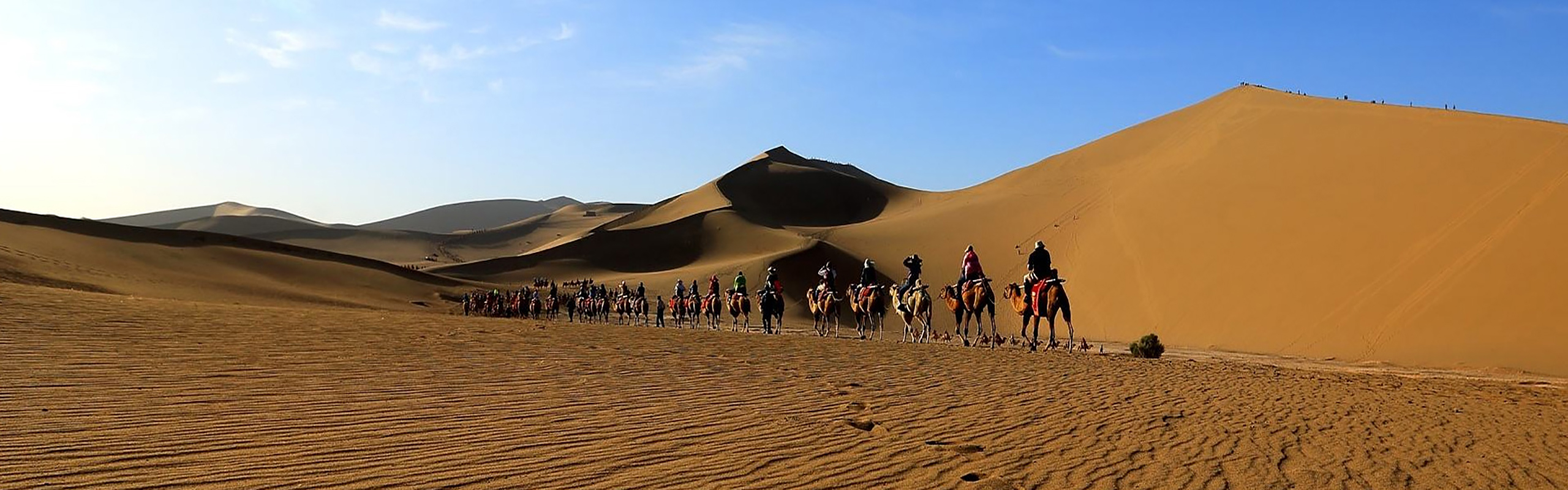 Desde la antigüedad, el transporte a lo largo de la Ruta de la Seda era muy difícil por las malas condiciones naturales como el clima ventoso y la escasez de agua. Para superar dichas dificultades, las caravanas en el desierto recurrían a los camellos para cargar las mercancías, ya que estos pueden transportar cargas más pesadas y necesitan menos agua que cualquier otro animal.